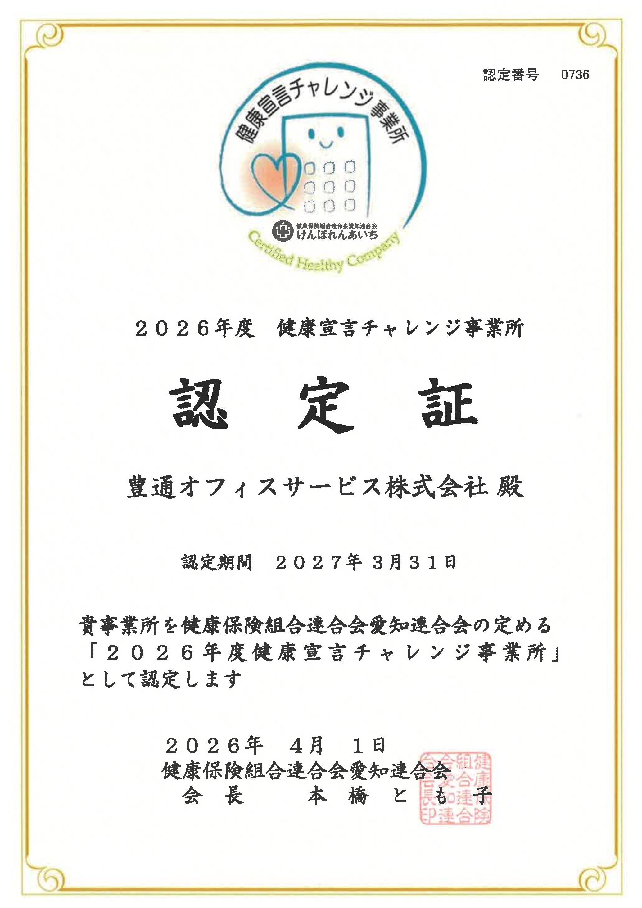 健康保険組合連合会愛知連合会より「2026年度健康宣言チャレンジ事業所」認定